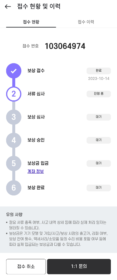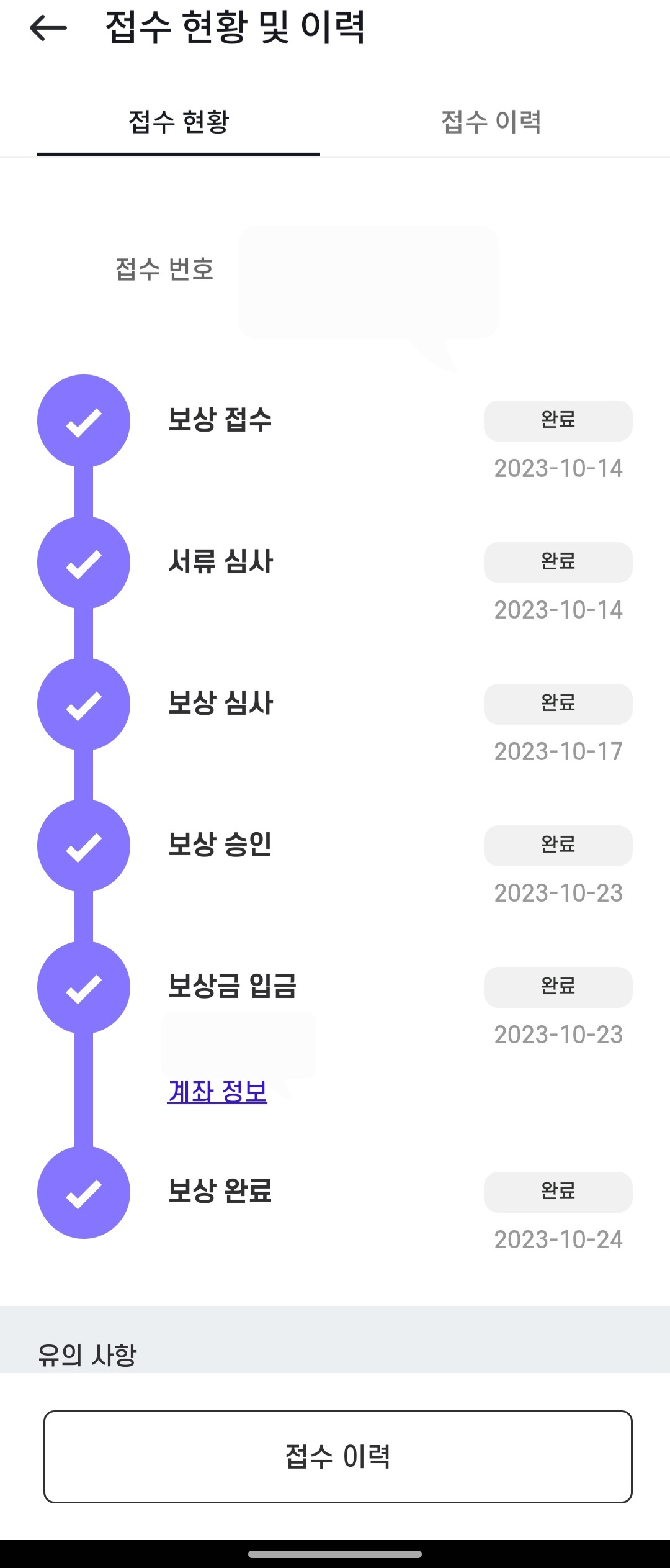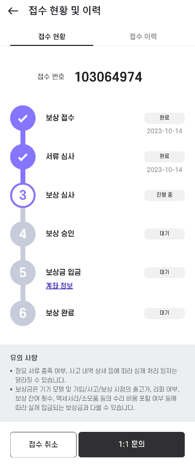 보상접수는 영수증과 수리명세서만 제출하면 30분 이내에 완료로 표시가 되었다. 토요일 오전에 수리를 하고 11시쯤 접수하였는데 12시 전에 보상접수 완료라는 알림을 받을 수 있었다.